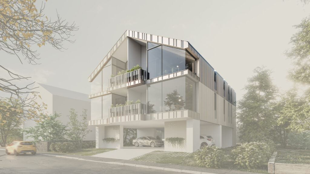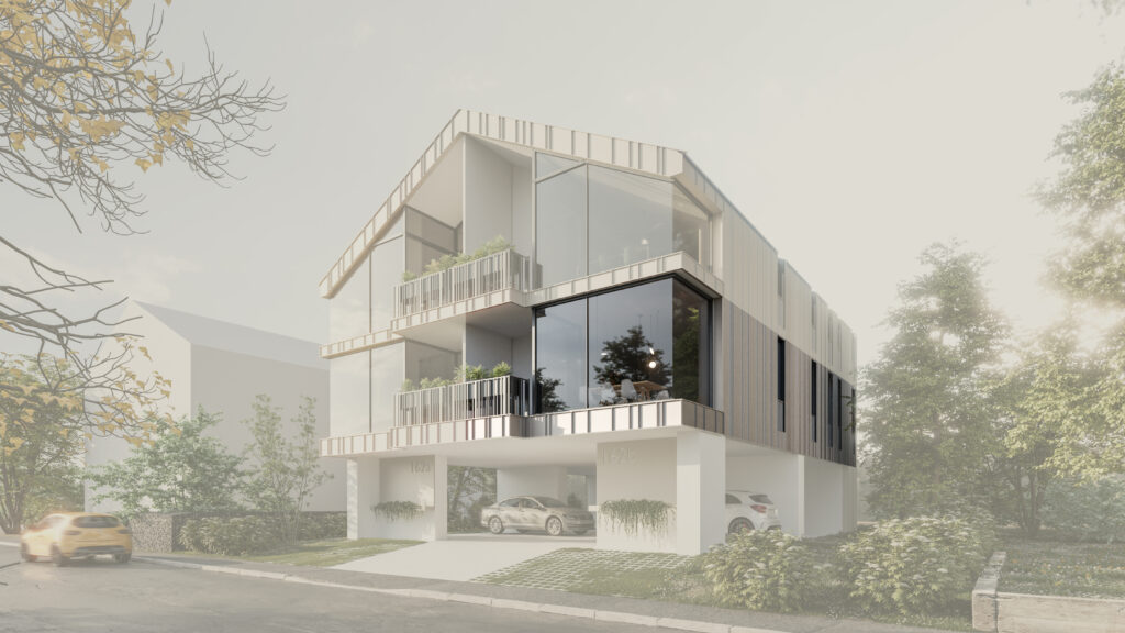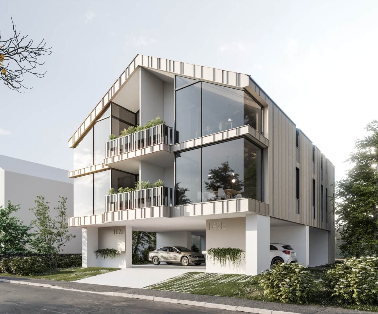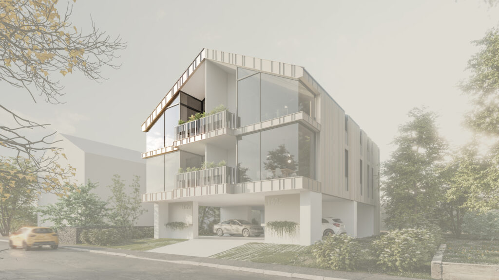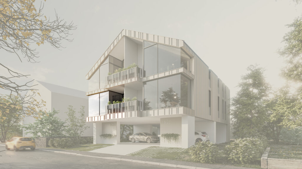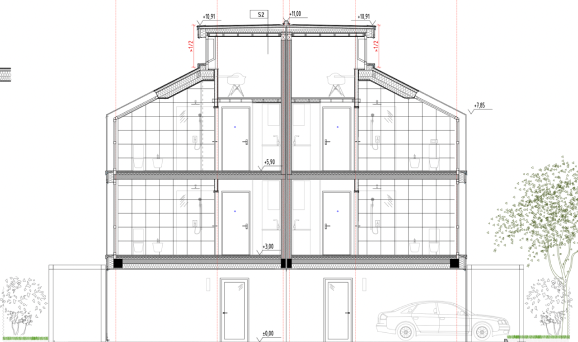 Večji del fasade bo prekrit s pločevinasto prezračevano fasado. Enak zaključni material bo uporabljen za strešno kritino. Fasade na območju parkiranja in na balkonih bodo zaključene s tankoslojno kontaktno fasado.