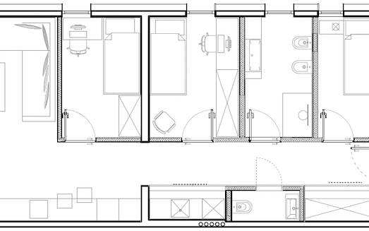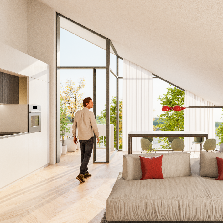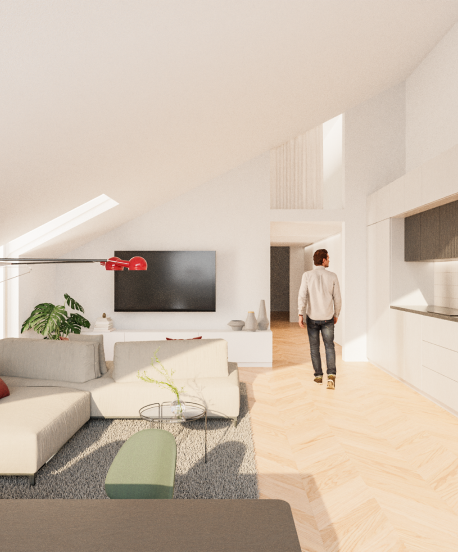 V 1. nadstropju se v vsaki enoti nahajata zrcalni stanovanjski enoti. Na S strani se nahaja vhod, od tam se preko hodnika nizajo spalnica, kopalnica in pa otroški sobi. Ob notranji neosvetljeni strani se nahajajo pomožni prostori, garderoba, wc in utility. Hodnik se odpre v kuhinjsko bivalni del na J delu objekta z ložo. Skoraj identična razporeditev prostorov se ponovi v etaži izkoriščenega podstrešja v obeh enotah dvojčka, le da je tam ena soba manj in zato tam večja tlorisna površina namenjena dnevnobivalnemu delu s kuhinjo. V etaži Po je predvidena frčada, ki bo omogočala dodatno svetlobo dnevnemu prostoru, glede na notranjo višino skoraj 5m pa ponuja tudi možnost izdelave galerije (v lastni režiji).